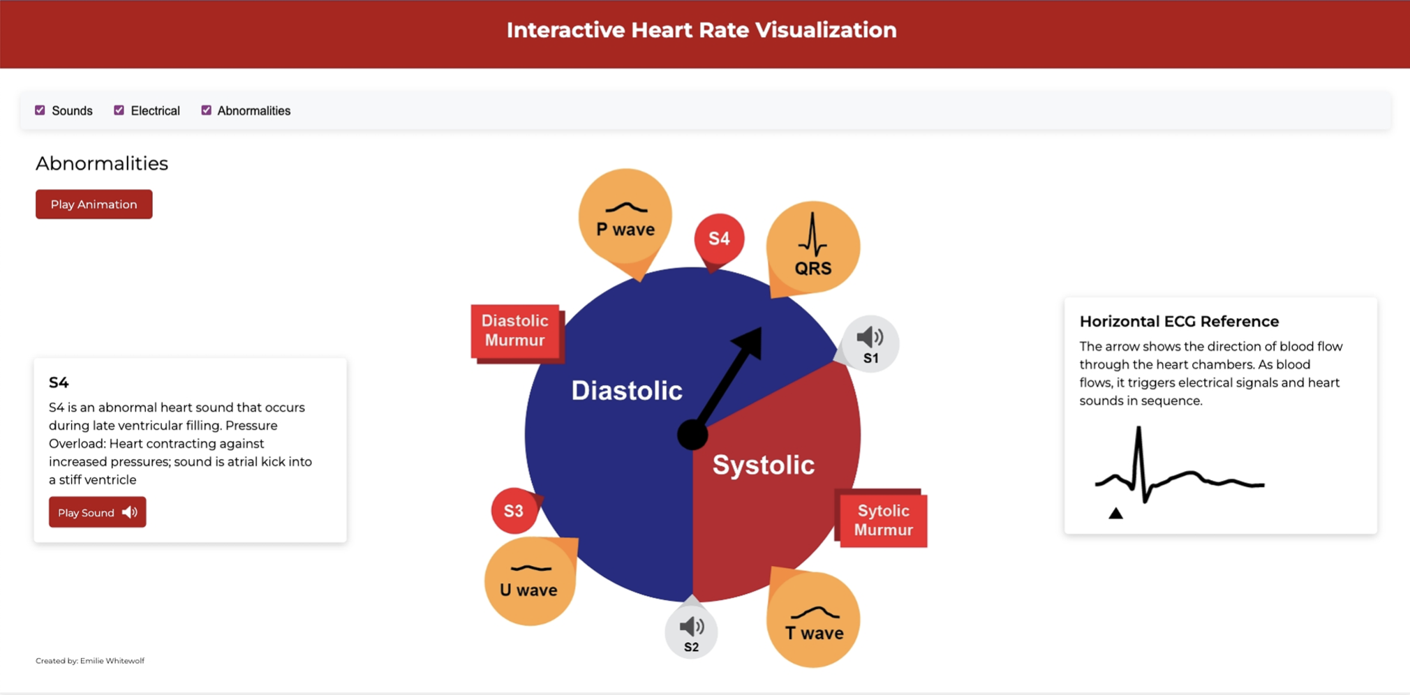 The tool contains three layers including sounds, electrical pulses, and abnormalities. Each layer can be toggled by the user. Users can click each individual sound, pulse, or abnormality to learn more about them. The tool also includes a mostly-accurate animation that shows the cycle alongside the stereotypical sound visualization of a heart beat.